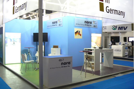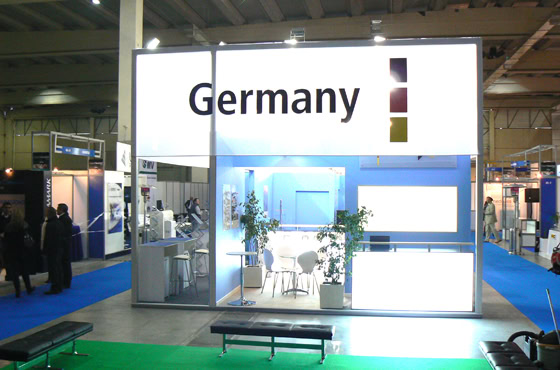 Deutscher Gemeinschaftsstand zur Expo-Hospital in Santiago de Chile. Die Expo Hospital ist eine internationale Messe für Krankenhaustechnologien, -produkte und -dienstleistungen. Am German Pavilion gab es acht Aussteller und einen Informationsstand unter einem textilen, lichtdurchfluteten Qubus. Im Kontrast dazu hellblaue Wände und leichte, weiße Möbel.